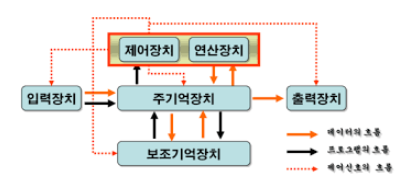 인간으로 따지면 두뇌에 해당하는 부분으로 주기억장치에서 프로그램 명령어와 데이터를 읽어와 처리하고 명령어의 수행 순서를 제어한다.
