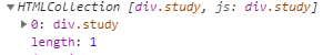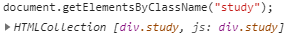 document.getElementsClassName("study") 메서드 실행 시 document 내에 있는 모든 태그의 class 속성 값이 ‘study’인 태그 정보들을 불러오게 된다. 한 개가 아닌 여러 개의 태그 정보를 불러오는 메서드 이므로 HTML Collection 형태임을 알 수 있다.