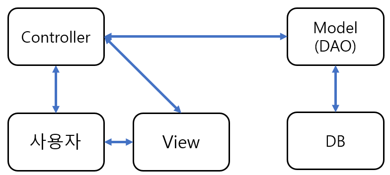 사용자 요청이 Servlet을 통해서 DTO 등의 파라미터로 Controller에 전송되고 서비스 로직을 거쳐서 DAO를 통해 필요한 데이터를 DB에서 가져온다. 받아온 데이터(Model)를 View에서 나타낼 데이터 형태로 변환하여 View를 생성한 후에 사용자 브라우저로 전송한다.