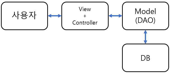 Model1 방식은 JSP 같은 View Page에서 View와 Controller 로직을 함께 작성하여 개발 속도를 높이고 흐름을 한눈에 파악할 수 있게 해준다. 그러나 서비스 규모가 커지게 되면 View에 수많은 Controller 로직이 포함되고 점점 유지보수가 힘들어진다.
